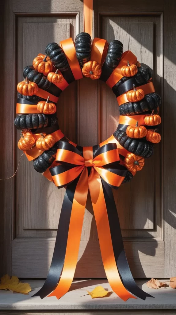 A timeless design, this wreath uses the two main Halloween colors—black and orange. Wrap a foam base with alternating ribbons, then add a big bow at the bottom. For extra flair, tuck in glittery pumpkins or bats. The bold color scheme instantly tells neighbors you’re in the Halloween spirit. This wreath works well on both traditional and modern doors, making it a versatile option for any home.