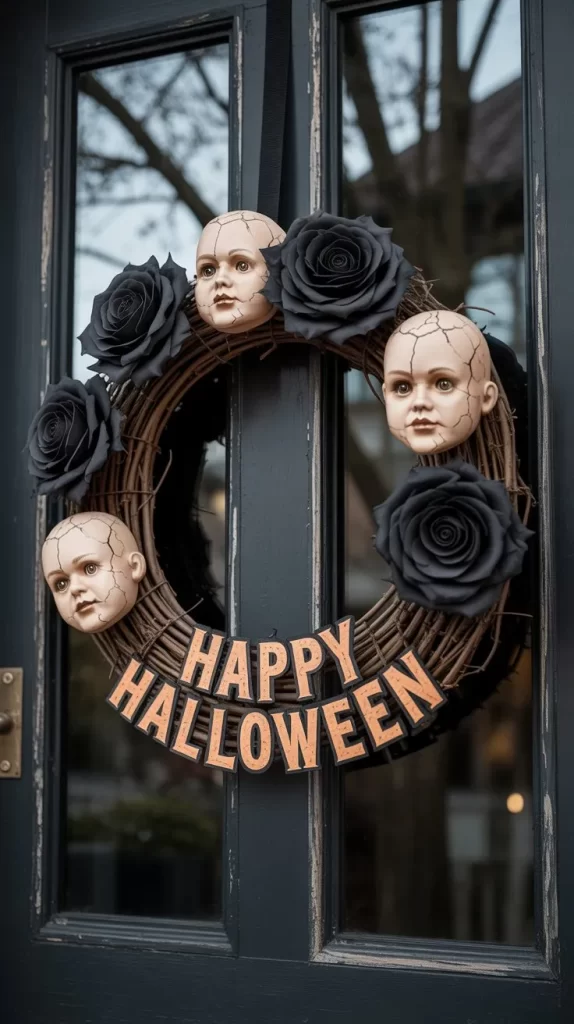 For a truly unique design, repurpose old doll heads by painting them white and adding cracks or glitter accents. Arrange them around a black wreath base with faux roses. It’s creepy yet artistic, making it a conversation starter for sure.