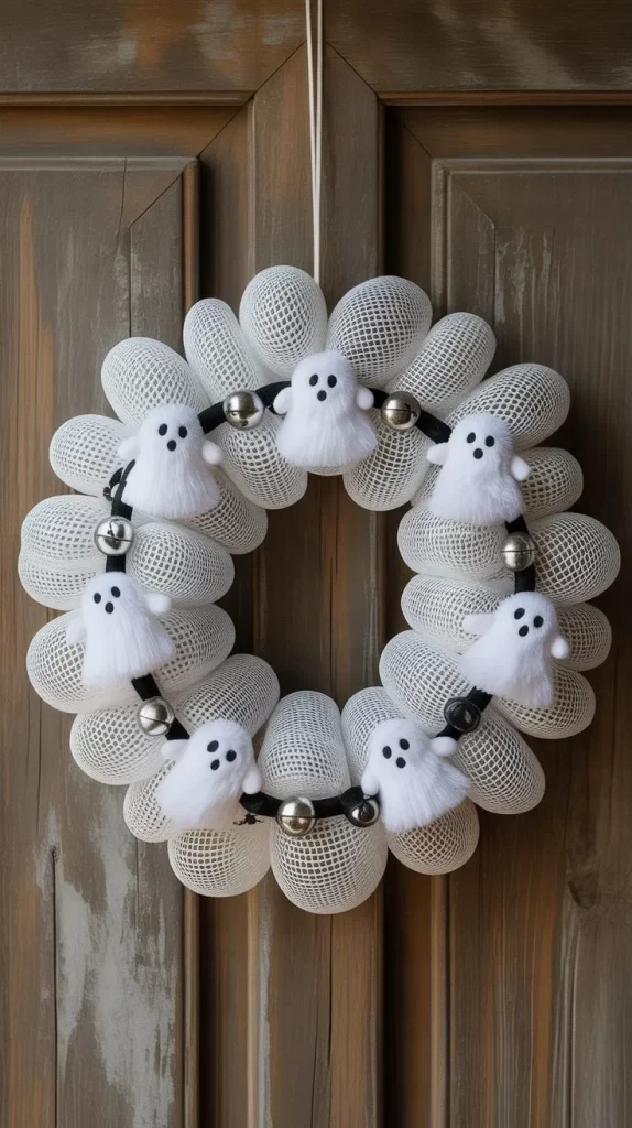 Create a softer, creepy-cute look with an all-white wreath. Wrap a foam base with white mesh or tulle, then add little ghost cutouts or plush ghost figures. You can even hang small bells inside for a playful “boo” sound when the door moves.
