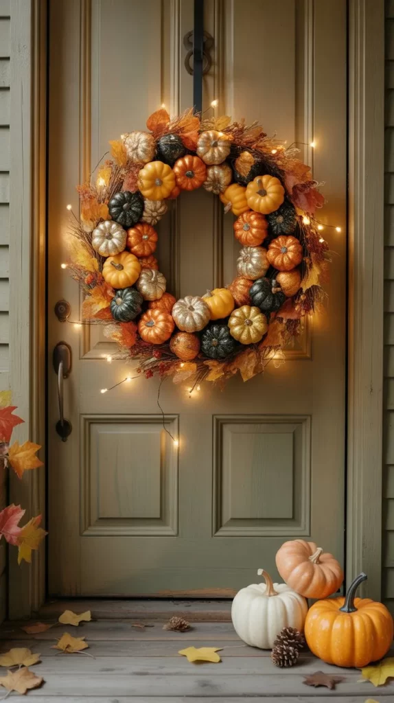 For sparkle lovers, this wreath is covered in mini glitter pumpkins. Mix gold, orange, and black pumpkins for a rich, festive look. Add fairy lights for extra shimmer at night. It’s bold, fun, and eye-catching.