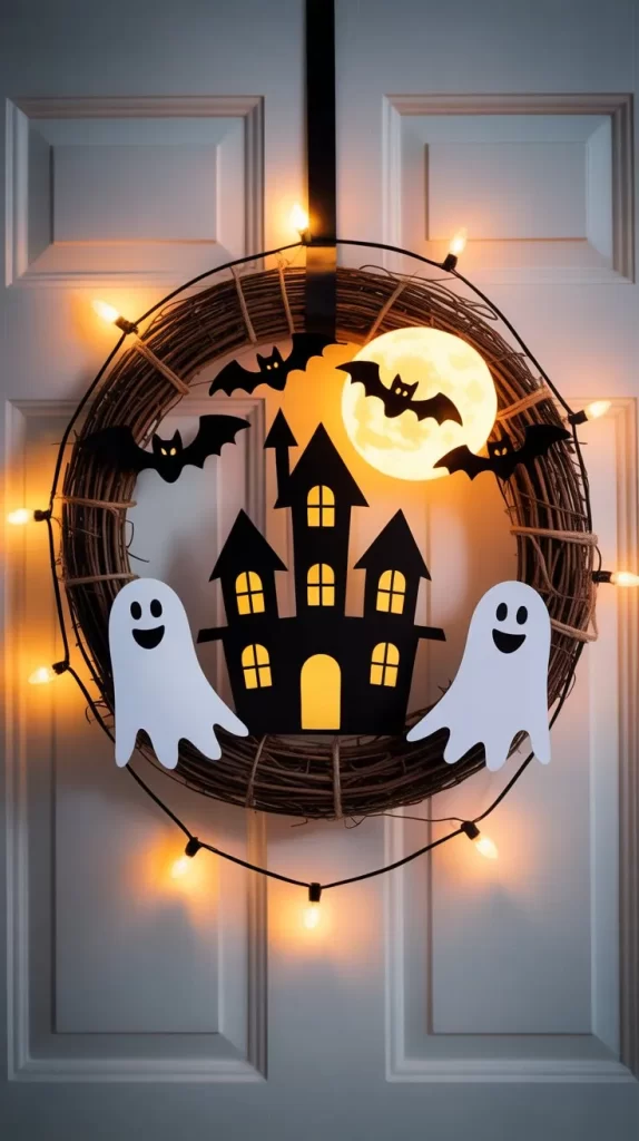 Cut out cardboard or foam haunted house shapes and glue them onto your wreath base. Add bats, ghosts, and moon cutouts for extra detail. This handmade design looks like a spooky scene framed in a wreath. It’s lightweight and budget-friendly, making it great for crafters of all ages.