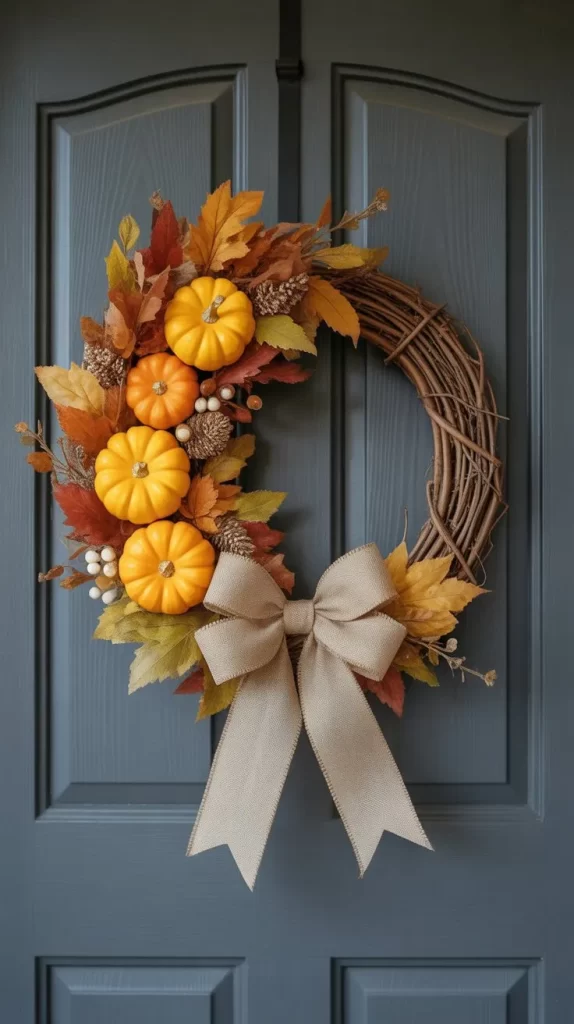 Bring fall harvest charm to your porch with a pumpkin-inspired wreath. Glue mini foam or felt pumpkins onto a grapevine base, mixing in faux autumn leaves and berries. Add a burlap bow for a rustic touch. This wreath combines Halloween and fall décor, so you can keep it up all season long.