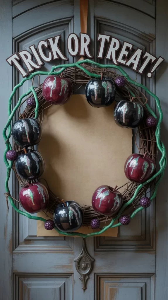 Inspired by fairy tales, this wreath uses faux apples painted with glittery poison-drip designs. Arrange them around a black wreath base and add green vines for contrast. It’s spooky, magical, and perfect for fans of classic Halloween stories.