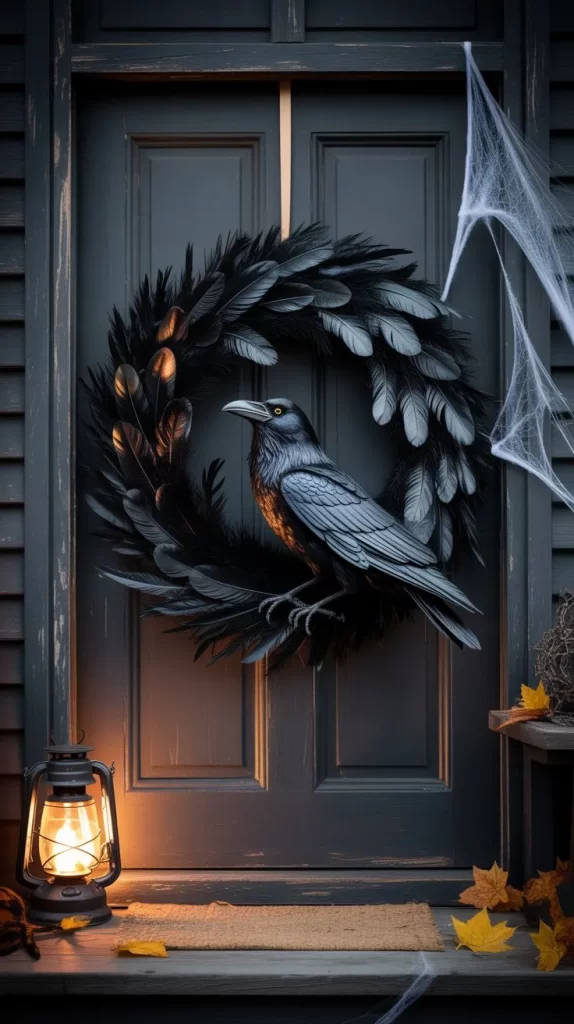 Channel Edgar Allan Poe with a raven-inspired design. Cover your wreath with black feathers, then perch a faux raven or crow at the top or bottom. This creates a moody, elegant vibe that’s equal parts spooky and stylish.