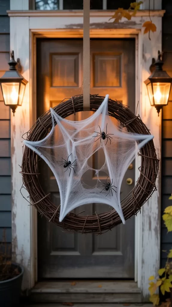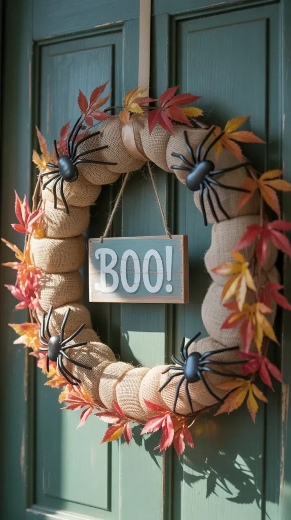 For a farmhouse feel, wrap burlap ribbon around a wreath base, then add faux spiders and webs. This style balances rustic charm with creepy details, making it perfect for porches that blend fall and Halloween décor.