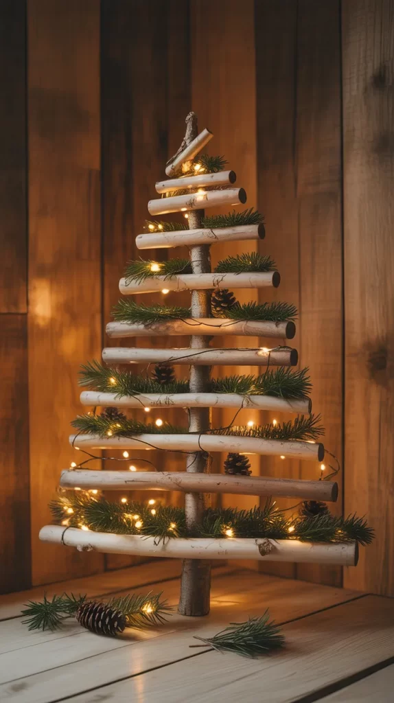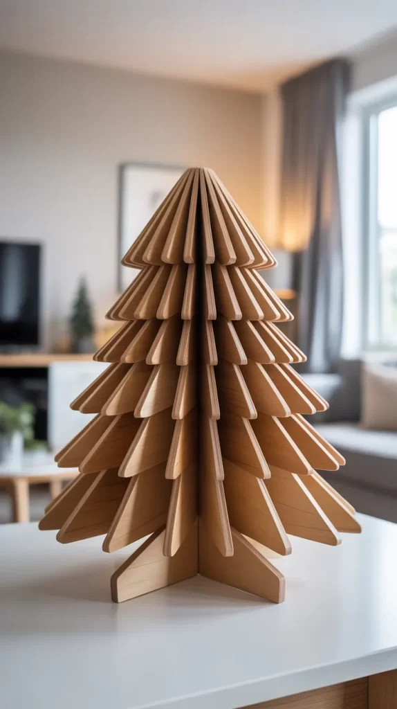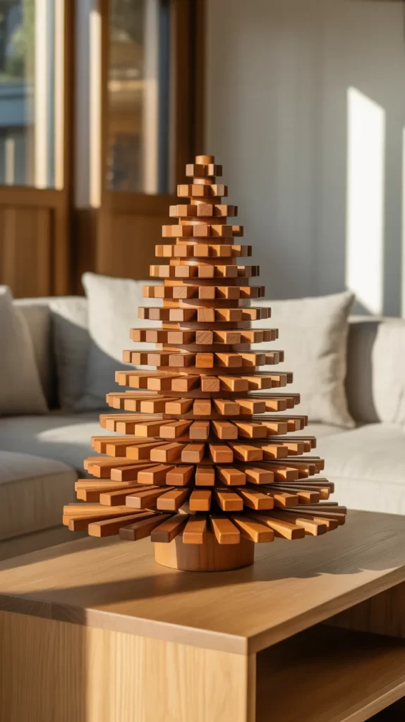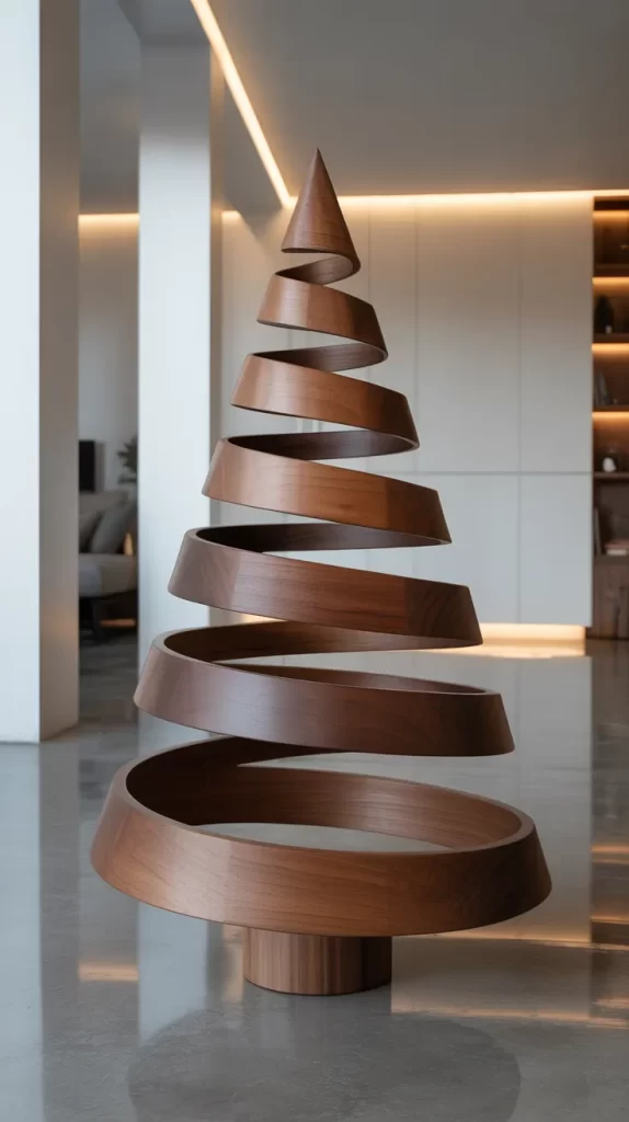 You might leave the wood natural or paint it in metallic tones. You can hang ornaments from each horizontal dowel, or wrap a light string around the spiral. This tree is excellent for minimalist homes or modern décor, where you want holiday presence without the fullness of a pine. It’s also compact and can act as a permanent décor piece.