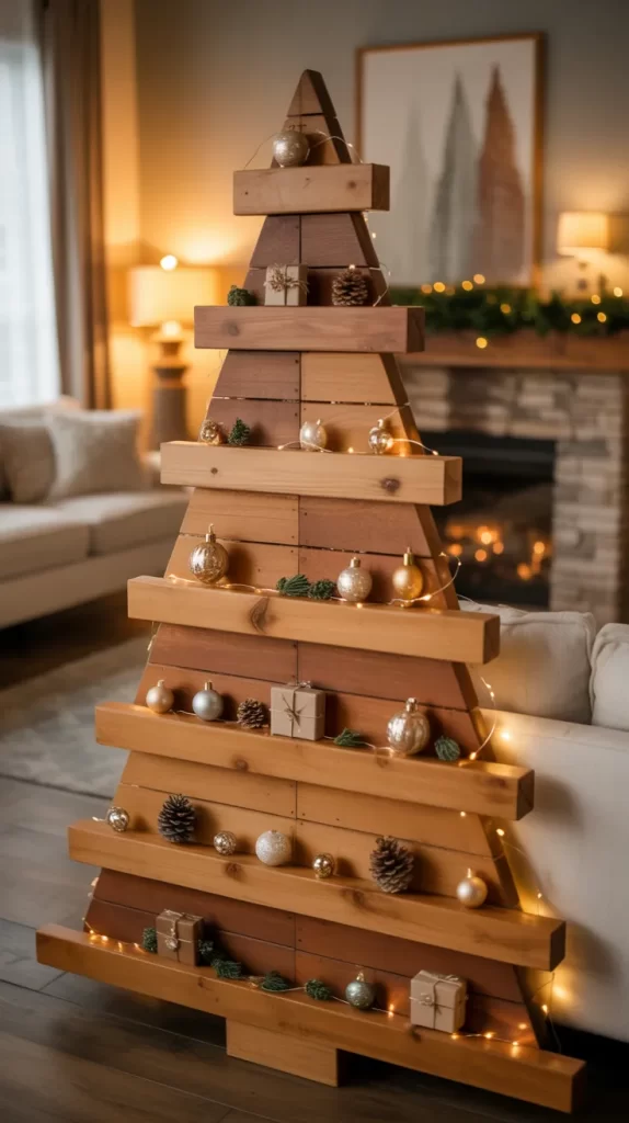 each level becomes a shelf where you place decorations, small plants, candles, or ornaments. It functions both as a tree and a display shelf all season long. You could switch it to display books or photos after Christmas. This approach blends functional furniture with festive form, making it versatile and long-lasting.