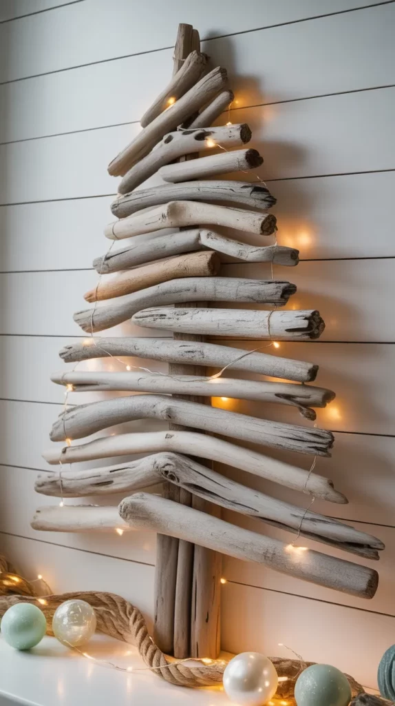 soft pale wood tones, organic irregular shapes, and a relaxed, beach-inspired holiday feel. You might hang shell ornaments, seashell garlands, or white lights to enhance the driftwood look. After the holidays, it can become art on its own wall.
