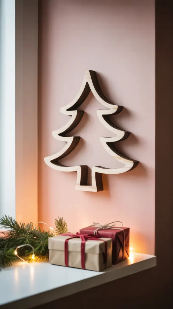 you could paint each “branch” line in alternating colours, or affix small hooks for hanging ornaments. Lights can be threaded around the cut-out or behind it for a halo effect. The flat tree is ideal for apartments or spaces where floor clearance is low. It also makes removal and storage simple after the holidays.