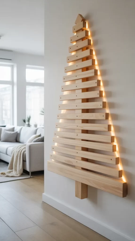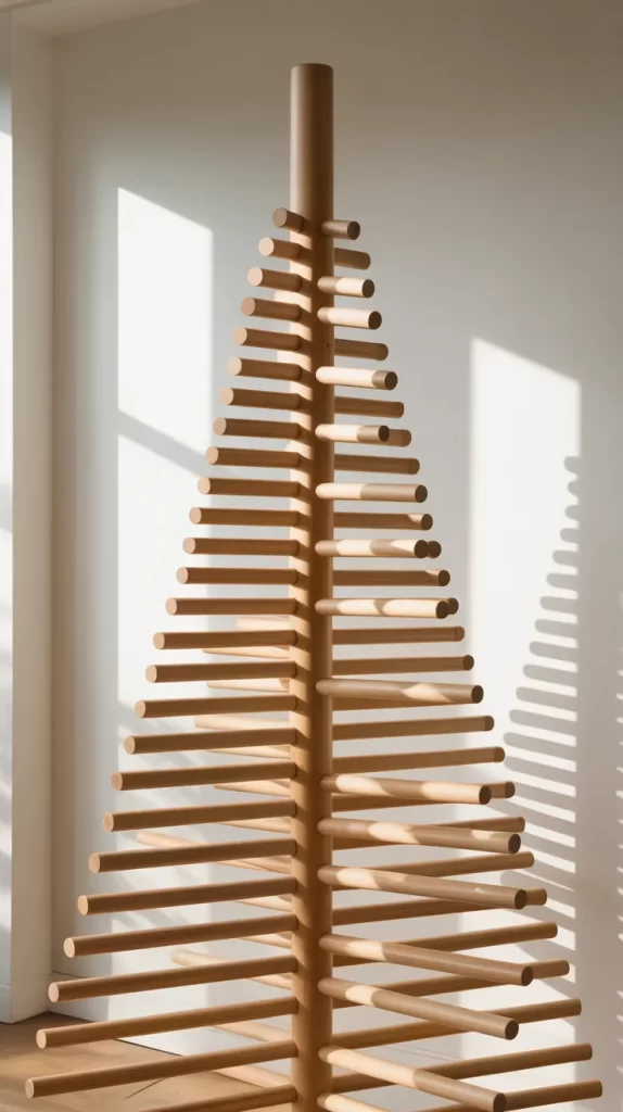 In this variation, you use wooden slats or dowels fixed horizontally on a wall, decreasing in length as you go up, creating a tree silhouette. The wood can be light-colored or painted white, giving a minimalist aesthetic. The first paragraph describes how to measure and mark the wall, attach slats securely, and perhaps paint or finish the wood to maintain a clean look. Because it’s wall-mounted, it saves floor space and gives a modern, graphic take on the tree shape.