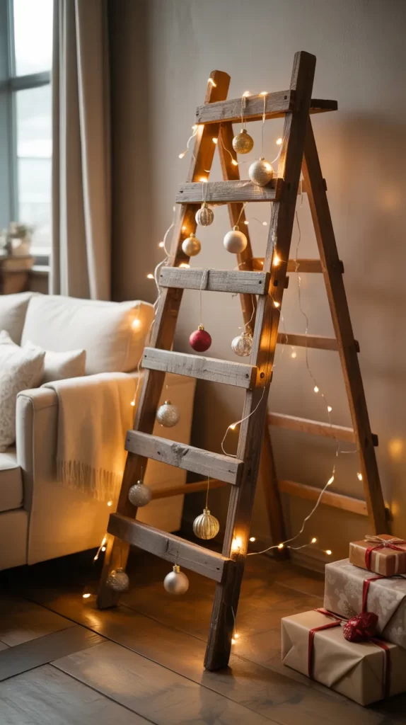 drape garlands, wrap lights, place small potted plants or candles on the rungs. The wooden ladder tree adds height and draws the eye upward. Since it leans, it uses vertical wall space and can be placed in corners. After the holidays you can repurpose the ladder for shelving or as décor.
