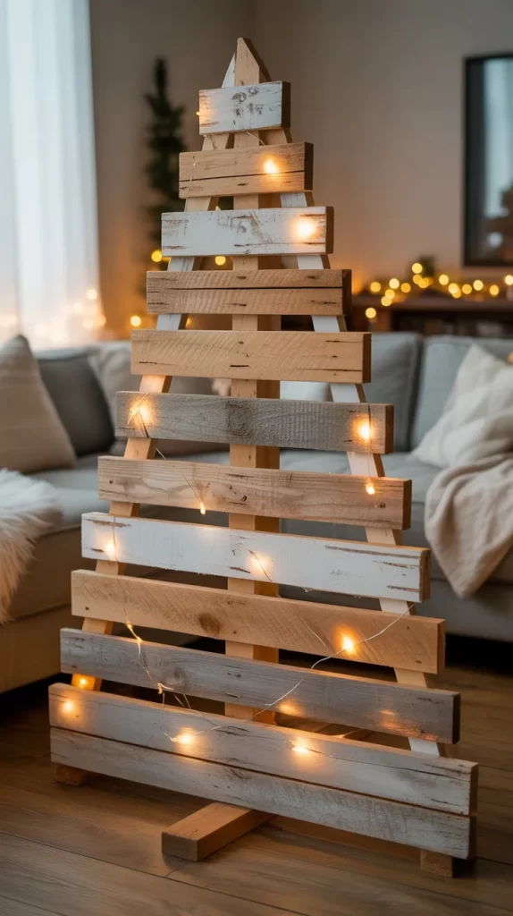 This idea uses reclaimed pallet planks cut to different lengths, stacked or arranged in a triangular tree shape. The wood’s rough texture gives a rustic feel, and you can leave it natural or paint it in festive hues. One paragraph might talk about selecting sturdy pallets, cleaning and sanding the boards, and arranging them from longest to shortest to form the triangle. Then decorative lights or ornaments can be clipped or hung directly onto the planks, giving a rustic, handcrafted look.