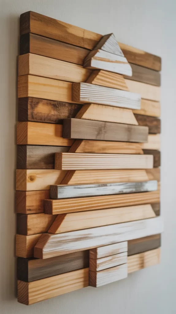 You can paint some shims white or gold for contrast, or leave them all natural for a monochrome look. It works as a statement piece in a foyer or hall and makes a great conversation piece—turning scrap wood into statement holiday decor.