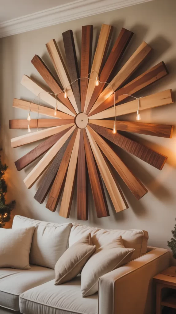you can hang small ornaments at the ends of each plank, add lights radiating from the center, or paint the tips white for snow effect. This dramatic style adds height and visual energy to a space, and gives you a unique take on tree form rather than a standard pyramid. After the season you might leave it as wall art.