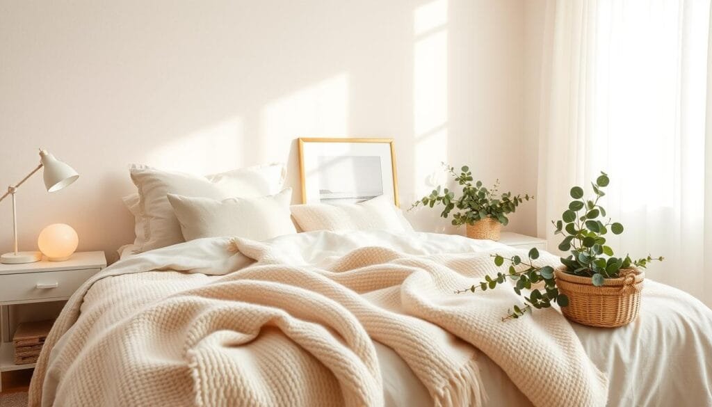 For cozy bedroom tips, set up a reading nook. Include a comfy chair, a floor lamp, and a side table. It’s the perfect spot to unwind with a book.