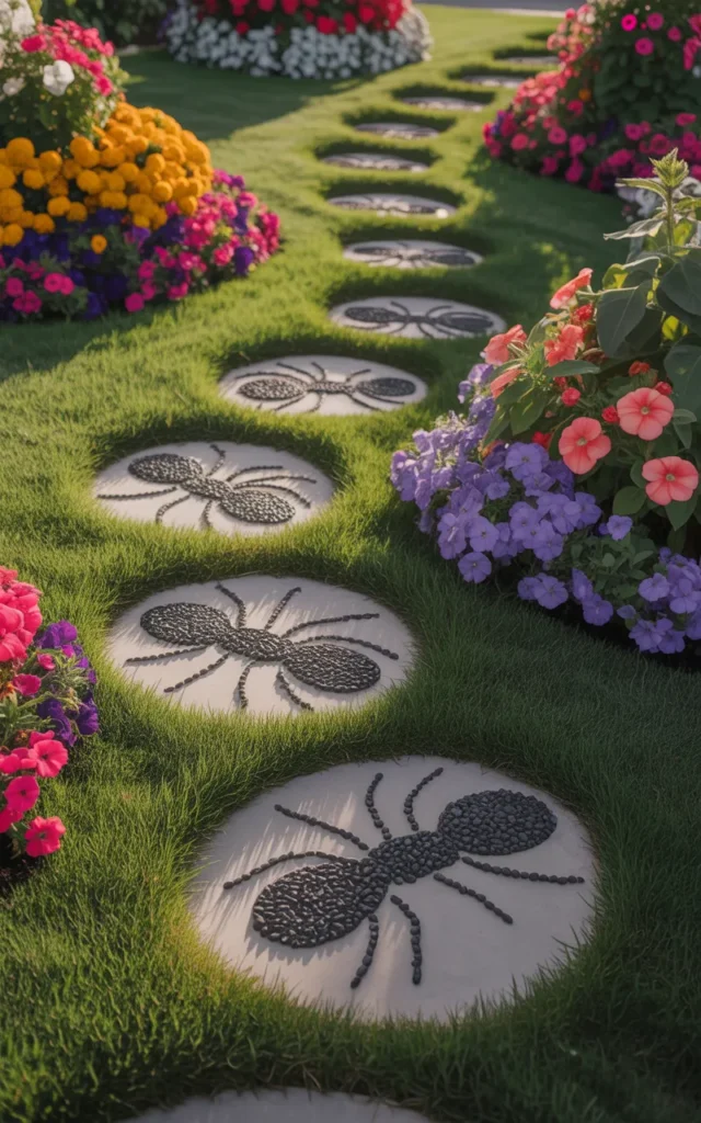 An ant trail garden uses small round planting beds connected by stepping stones like ants marching in a line. Each circle can hold flowers or herbs, while dark stones form tiny ant shapes between sections.