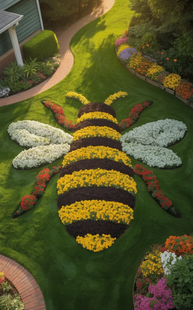 A bee garden is bright, happy, and full of character. Use yellow flowers and dark mulch or black stones to create striped sections on the body. Add rounded wing beds with white flowers or silver foliage. Small shrubs can shape the head area.