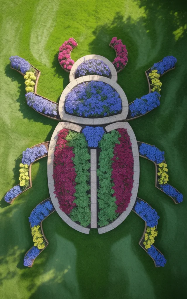 A beetle garden uses deep blue, purple, and green flowers to mimic shiny jewel tones. Rounded stone borders form the shell, and symmetrical wing sections create balance.