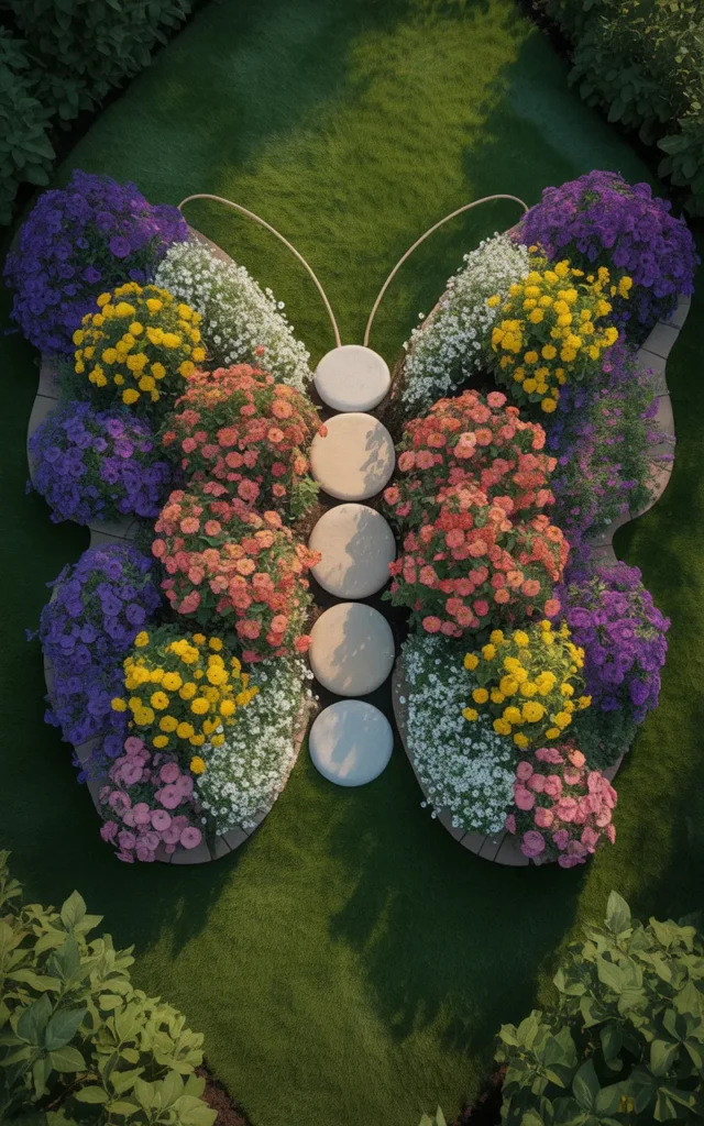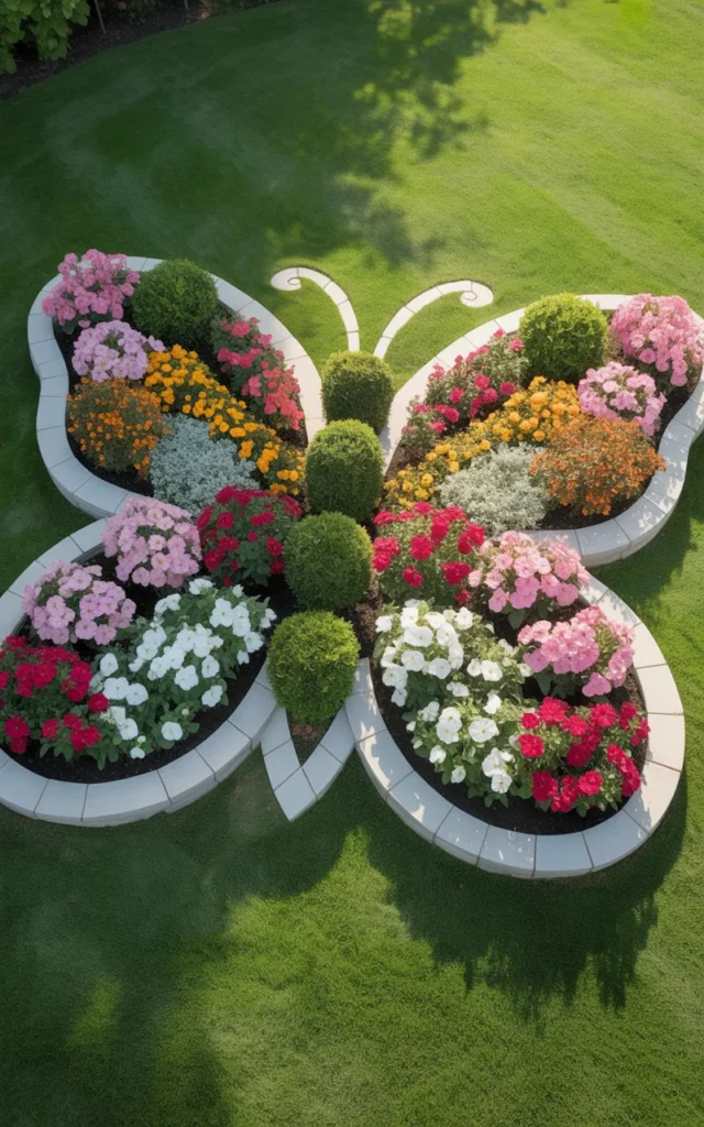 A butterfly-shaped garden is one of the most popular insect garden ideas for backyards. Use curved stone edging to form two large wings, then fill each section with colorful flowers like zinnias, petunias, daisies, and marigolds. Small round shrubs in the center can create the butterfly body, while white pebbles around the design make the shape stand out clearly.
