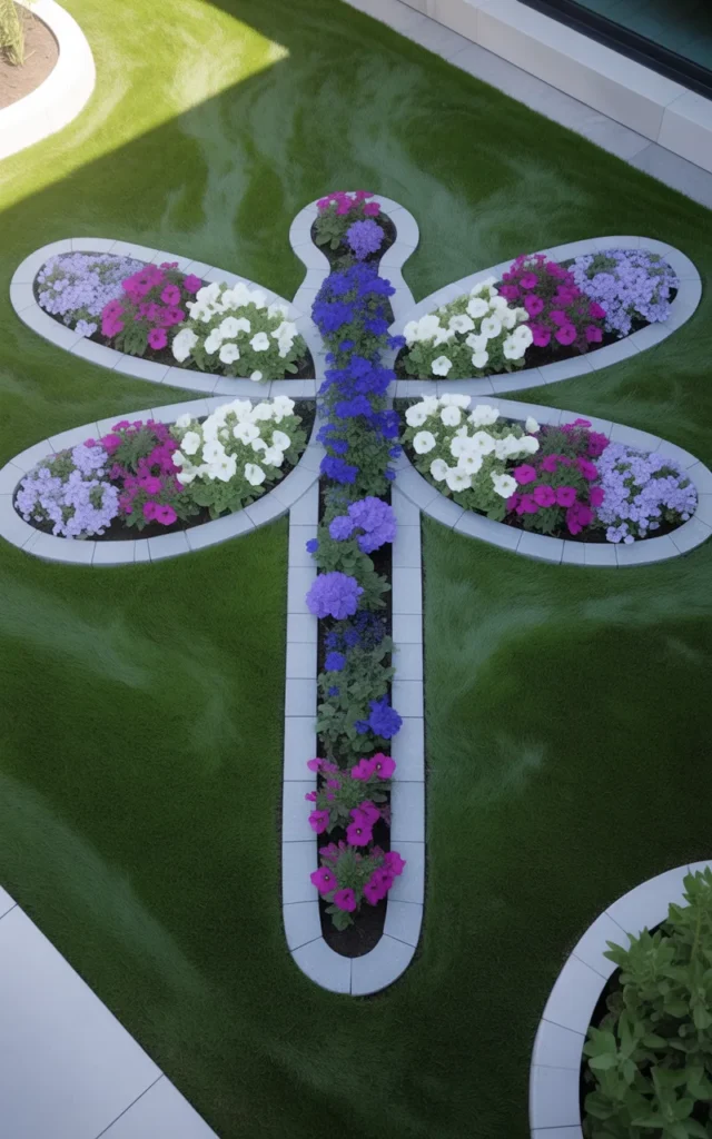 A dragonfly-shaped flower bed looks elegant and modern because of its long body and wide wings. Use narrow stone edging for the body and create four slim wing sections with pebbles and flowers. Choose blue, purple, and white flowers for a fresh natural look.
