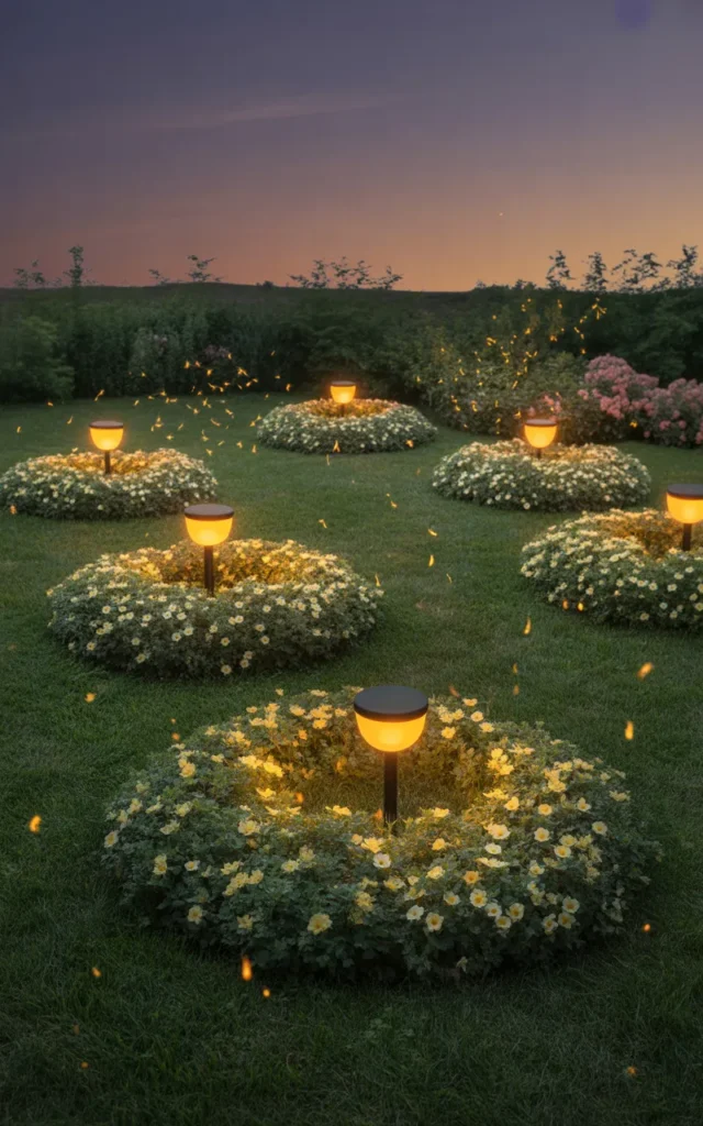 A firefly layout is perfect for evening spaces. Create small glowing garden pods using circular flower beds with solar lights in the center. Arrange them like flying fireflies across the lawn.