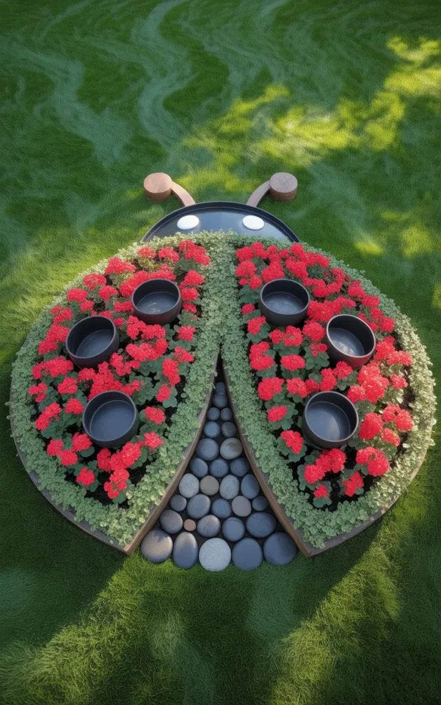 A ladybug garden bed brings a playful and cheerful look to outdoor spaces. Build a round body shape using black and red flowers or colored mulch. Add stone lines to divide the wings and use dark pebbles or plants to create the famous ladybug spots. Small antenna shapes can be made with metal rods or thin shrubs.