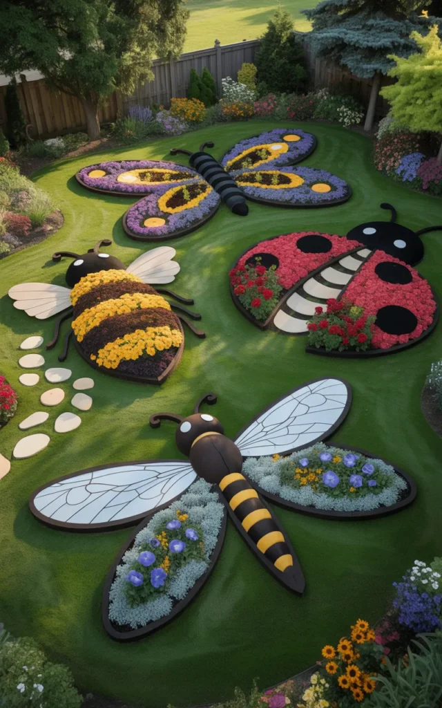 Create one large backyard zone with several mini insect beds such as a butterfly, bee, ladybug, and dragonfly. Connect them with pebble paths and matching flowers for a themed outdoor display.