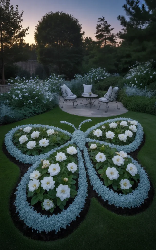 A moth-shaped garden looks soft and elegant. Use pale flowers, silver foliage, and white stones to create wings with gentle curves. Place it near a seating area for a peaceful night garden effect.