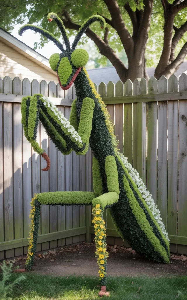 A praying mantis design uses a long body and folded front legs in a corner space. Use green shrubs and narrow flower strips to shape the insect against a fence.