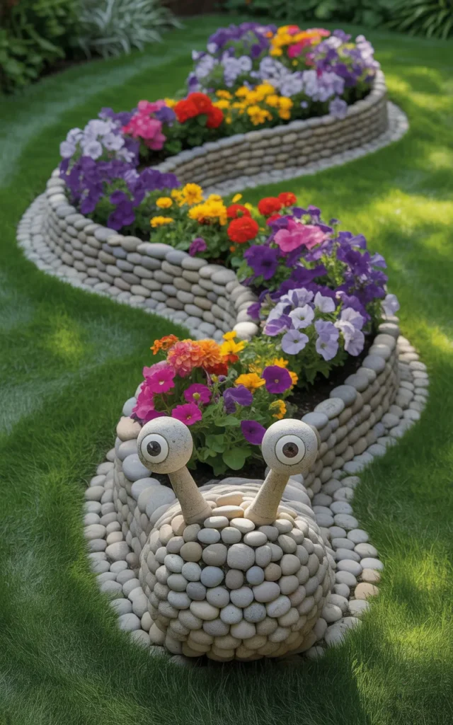 A snail-shaped garden combines a spiral shell with a curved body. Use stone edging for the shell swirl and fill it with layered flowers. The body can be made with low greenery and decorative eyes from stones.
