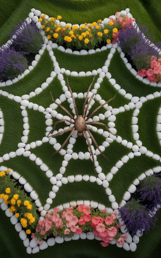 A spider web layout creates dramatic visual interest in modern yards. Use gravel or pebbles to form web lines in a circular pattern, then place flowers between sections. A small shrub spider or metal accent can complete the theme.