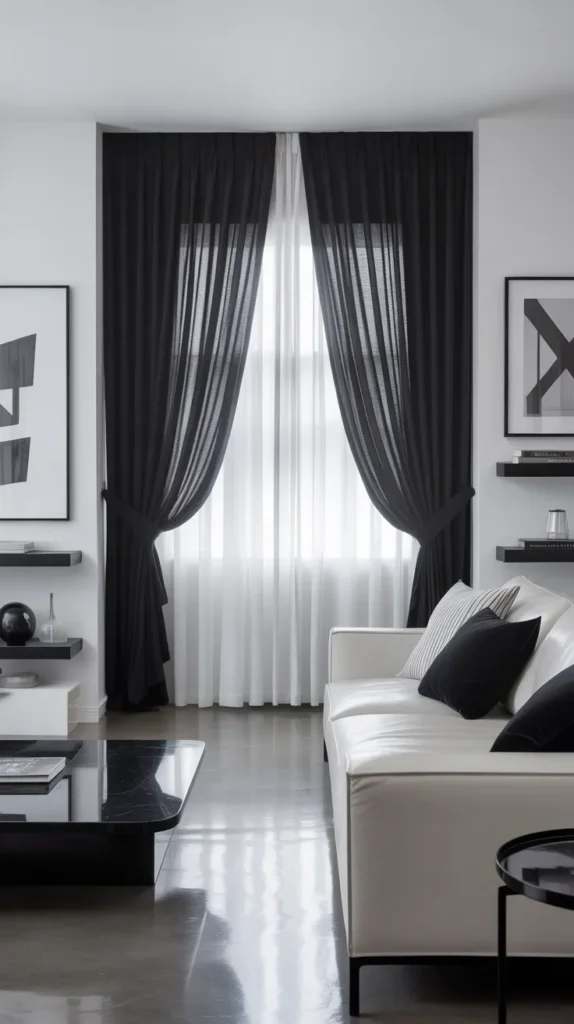 A black and white layered curtain setup offers a bold and modern look. White sheers keep the room bright, while black drapes add contrast.