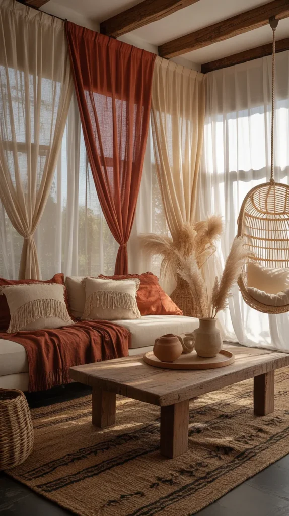 Textured sheers paired with earthy-toned curtains create a boho-inspired look. This style adds warmth and personality to your living room.