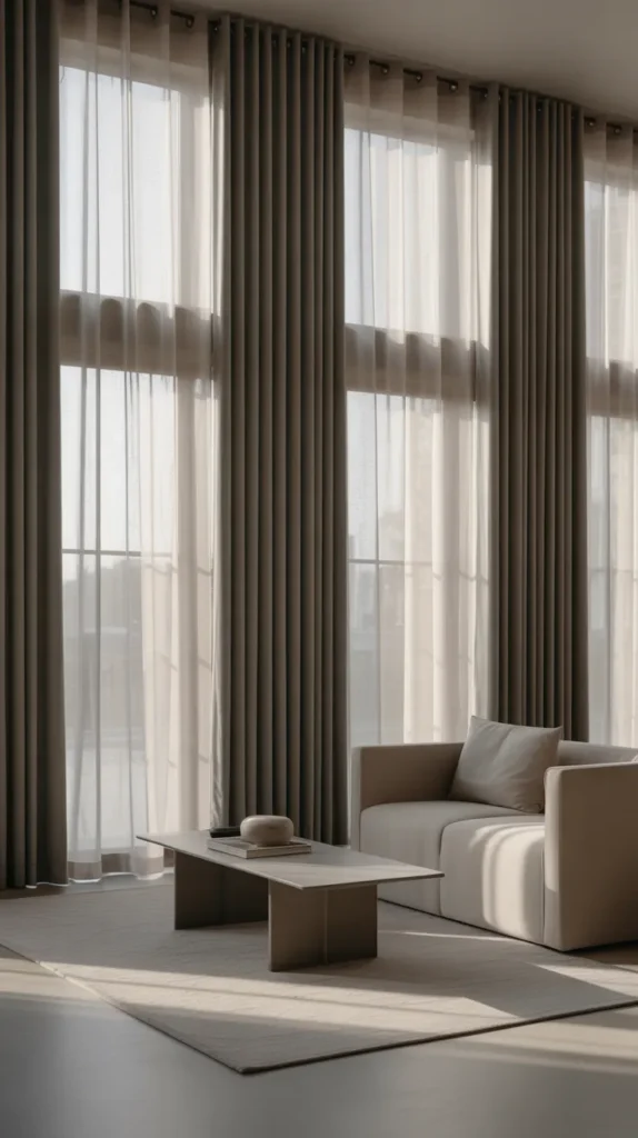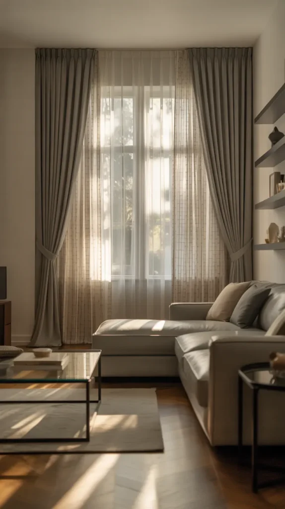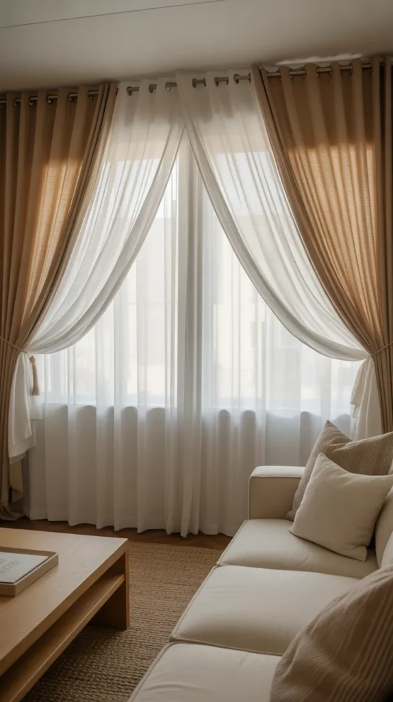 Neutral sheer curtains paired with beige blackout curtains create a calm and timeless look. The sheers allow soft daylight to enter, while the blackout layer gives privacy and blocks harsh sunlight when needed. This combination works well in modern and minimalist living rooms.