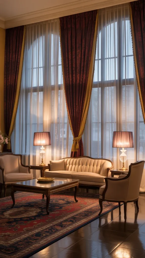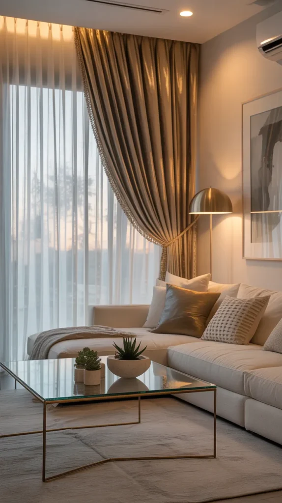Sheers combined with metallic accent curtains add a touch of glamour. Gold or silver-toned drapes can elevate the overall design without making the space feel too heavy.