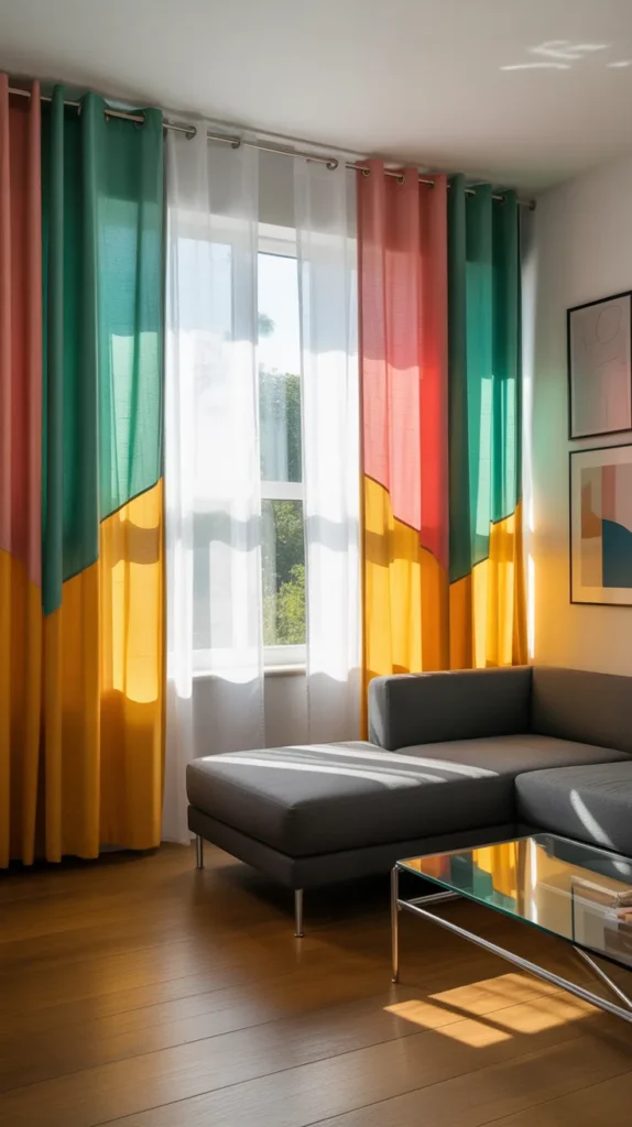 Color-block curtains layered over sheers create a bold and creative design. This style adds energy and personality to your living room.