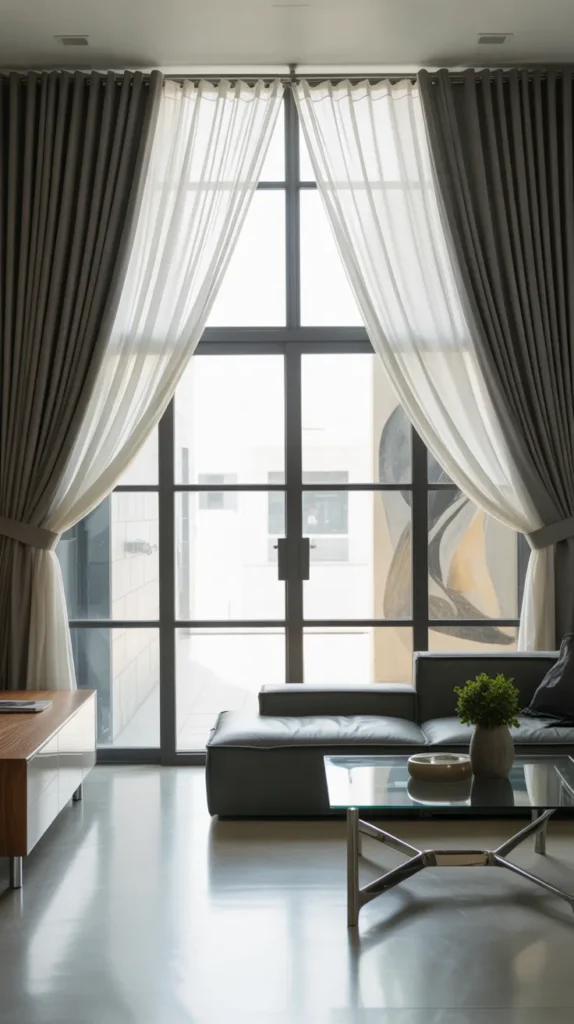 White sheers combined with dark gray drapes create a strong contrast that looks modern and stylish. This layered curtain idea is perfect for adding depth and character to your living room. The white sheers brighten the space, while the gray drapes add a bold touch.