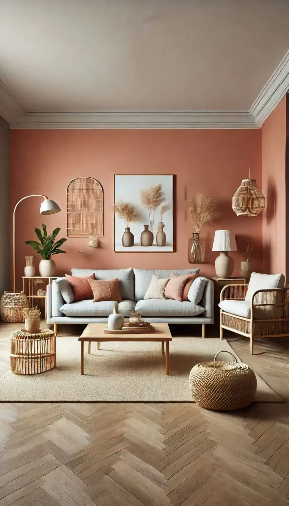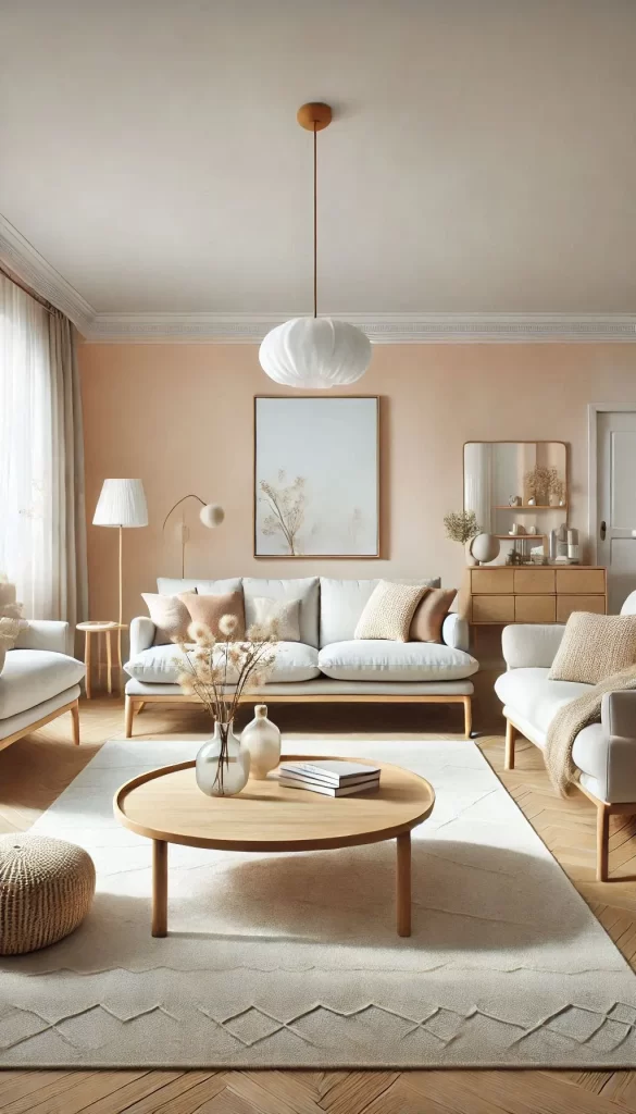 Soft peach is a light, fresh color that adds warmth and brightness to any living room. It’s perfect for creating an inviting and airy space.