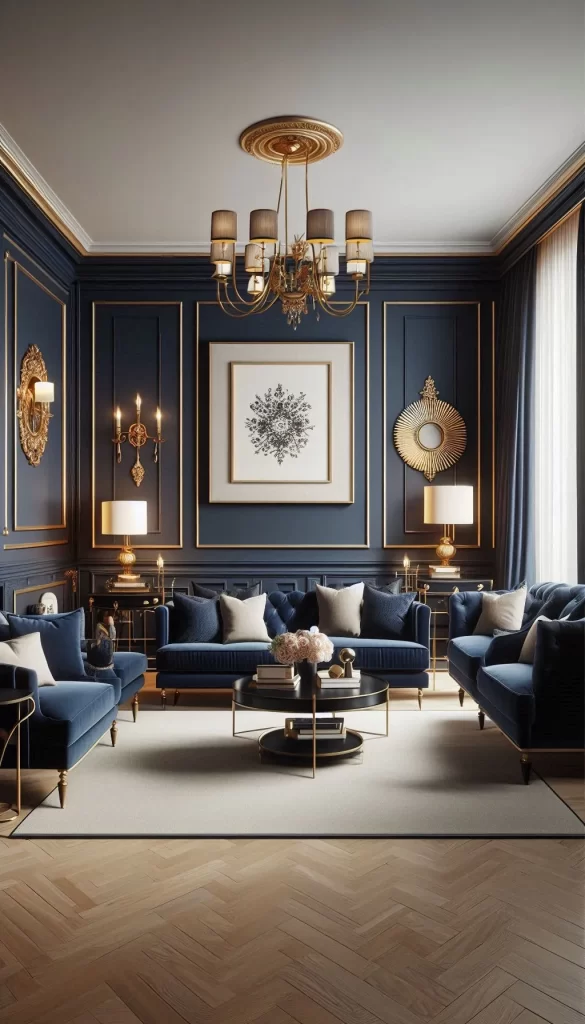 Navy blue has a timeless, elegant quality that can instantly elevate your living room’s decor. It works especially well in larger spaces or rooms with high ceilings.