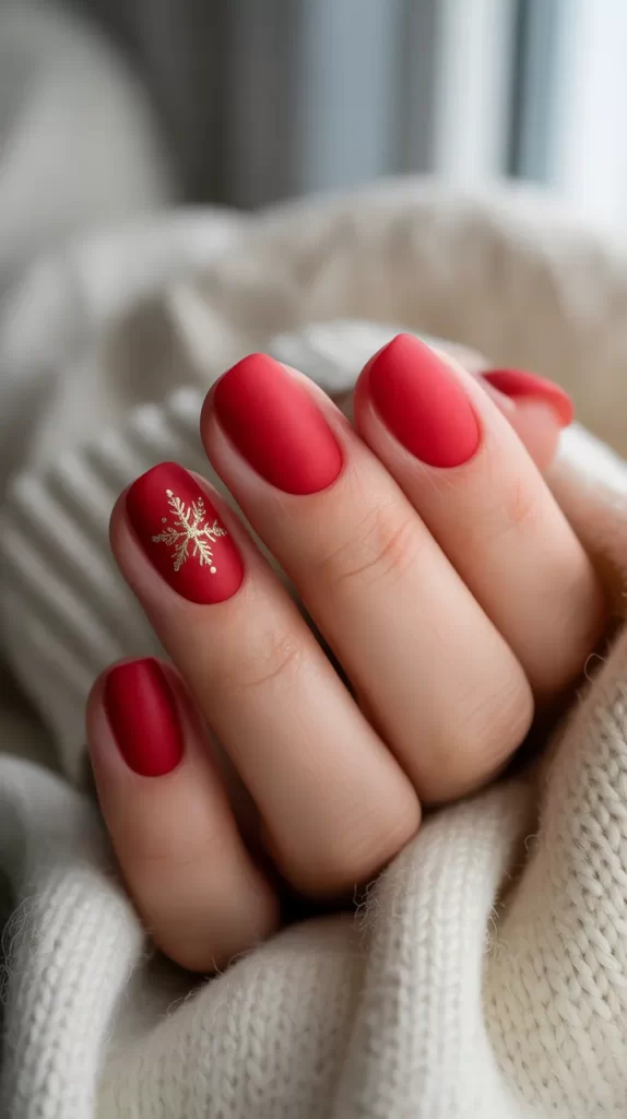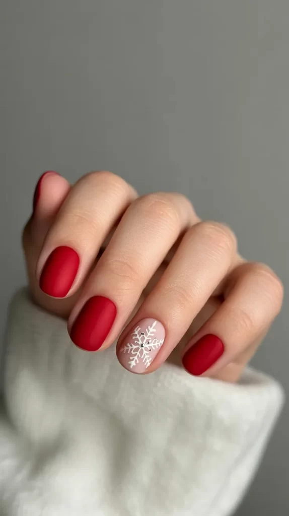 Focus on one accent nail with a detailed snowflake design while keeping the rest matte red. This minimal approach is subtle yet festive, perfect for those who love understated elegance.