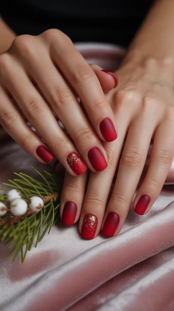 Try a matte red ombre effect, blending from dark red to lighter shades. You can enhance the look with subtle gold or silver glitter at the tips.
