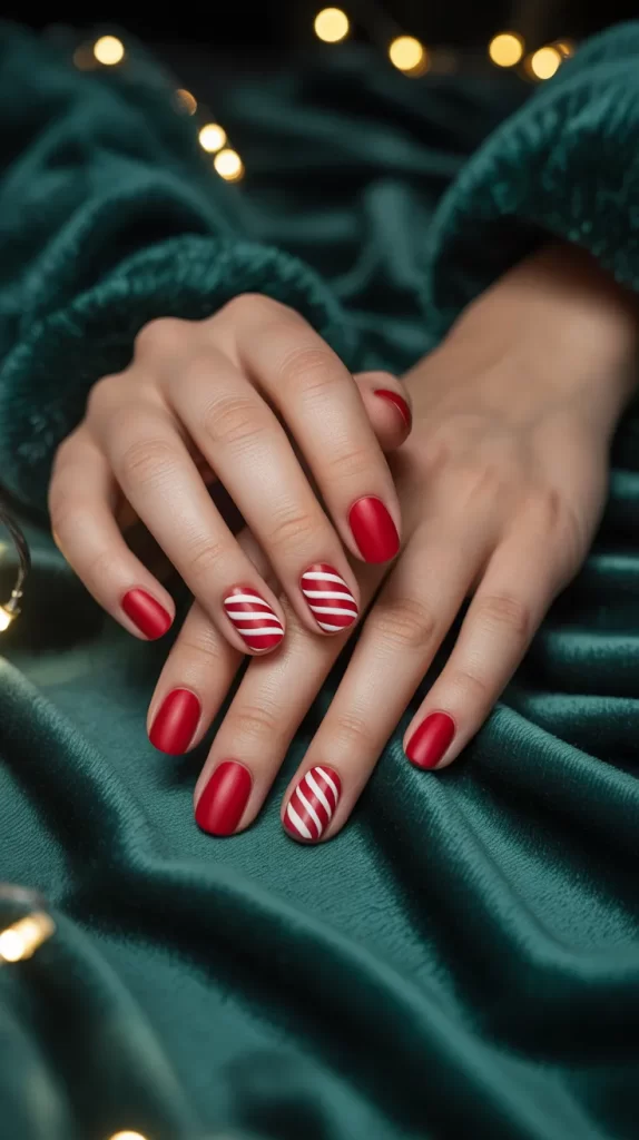Candy cane stripes add a cheerful touch while keeping the matte red base sophisticated. It’s a versatile design for short and long nails and works well with both casual and party outfits.