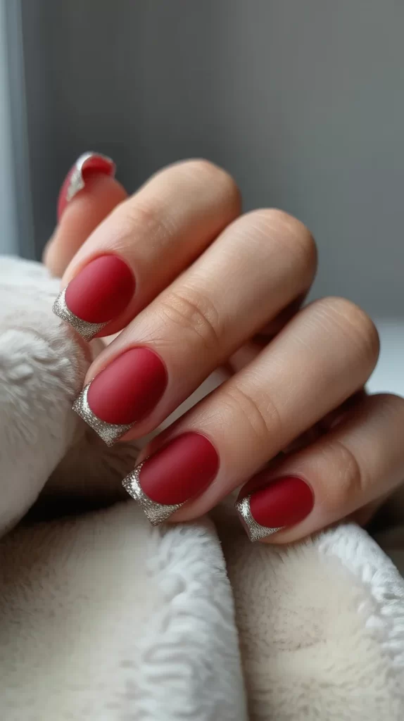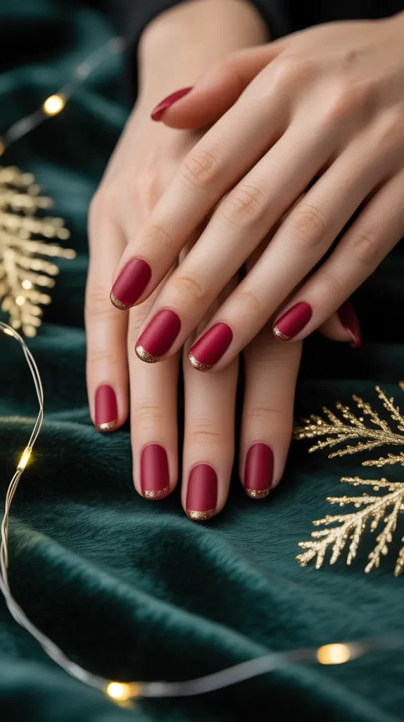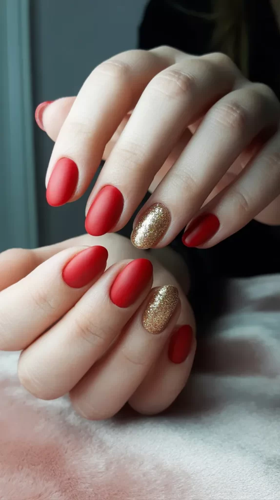 Combine elegance and sparkle with matte red nails featuring thin gold tips. The gold adds a festive shimmer while maintaining the sophistication of the matte finish. You can create French tips or diagonal lines for variation.