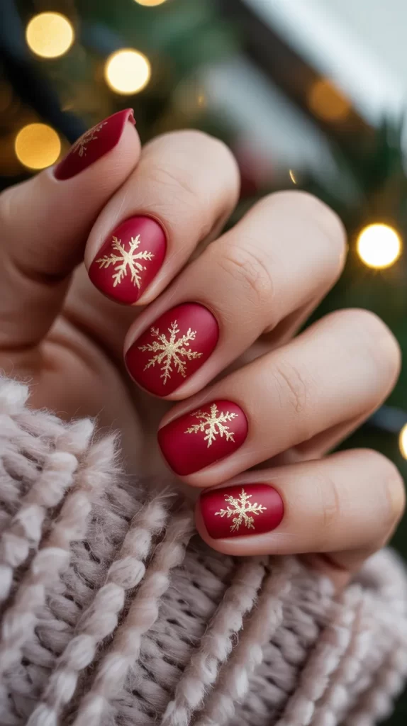 Elevate your manicure with gold snowflakes on matte red nails. Metallic gold contrasts beautifully with matte red, creating a luxurious and festive look.