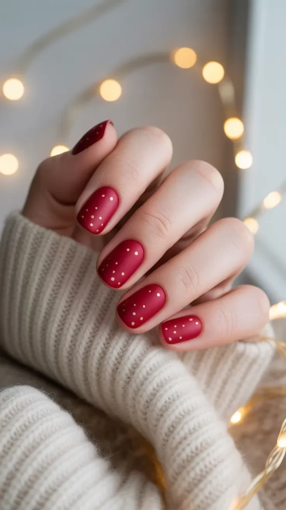 Add tiny gold dots scattered on matte red nails for a subtle yet festive touch. This minimalist design is simple and classy.