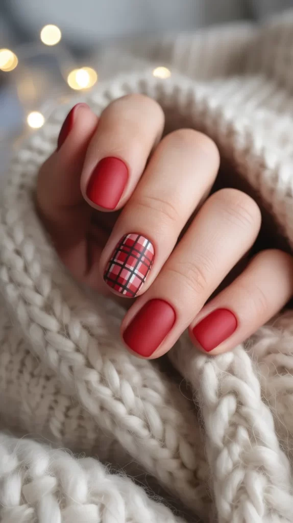 Create a red, white, and black plaid accent nail while keeping others matte red. Plaid brings a cozy, classic holiday feel to your manicure.