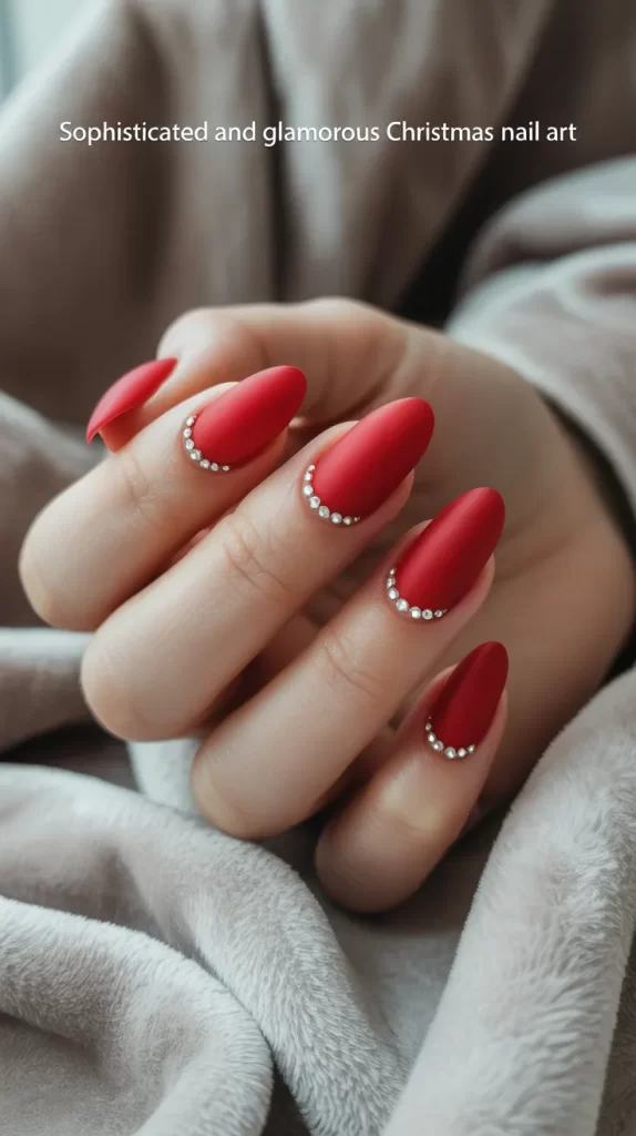 Rhinestones can be arranged in patterns or used sparingly for a minimalist effect. This design is perfect for holiday parties or photoshoots, giving your nails a festive sparkle while remaining elegant.