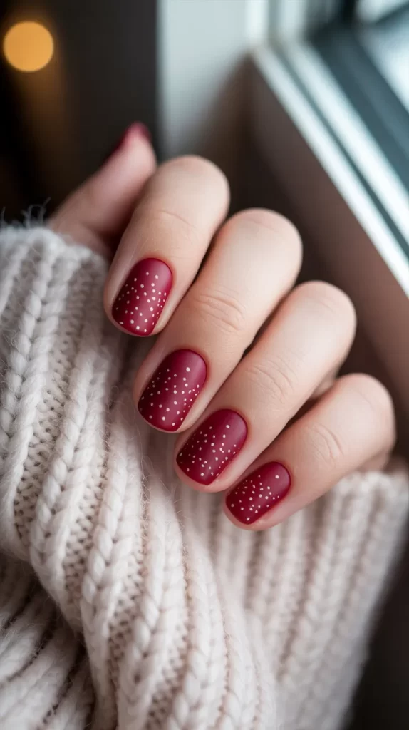 Create a subtle winter effect with small white dots on matte red nails, resembling gentle snowfall. The minimalist design evokes a magical, snowy atmosphere.