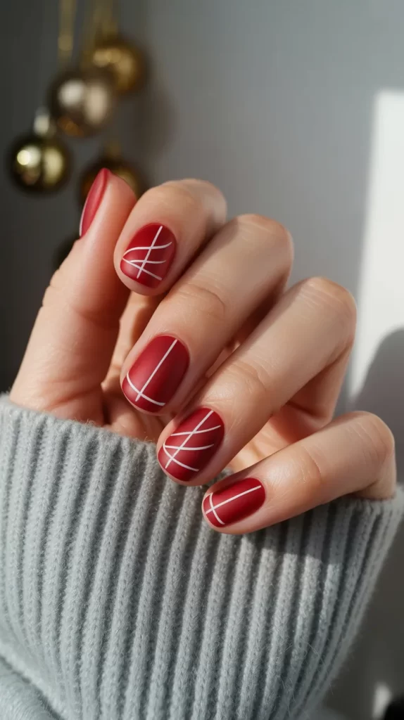 Draw thin, minimalist white lines on matte red nails for a geometric, modern look. This style is sleek, sophisticated, and holiday-appropriate.