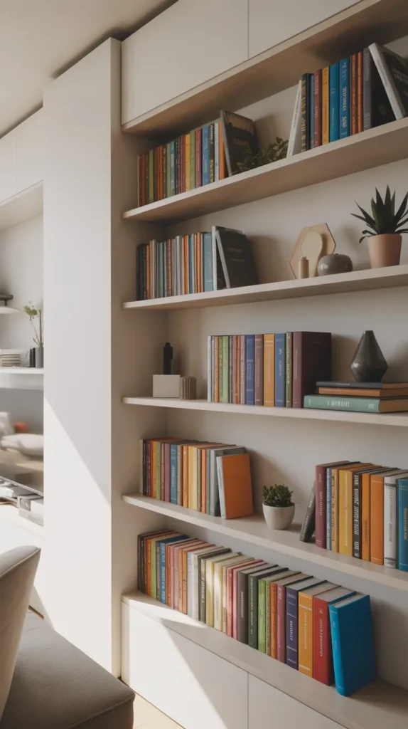 Minimal shelves styled with colorful books or decor items bring personality. Keep shelf design simple and spacing open.